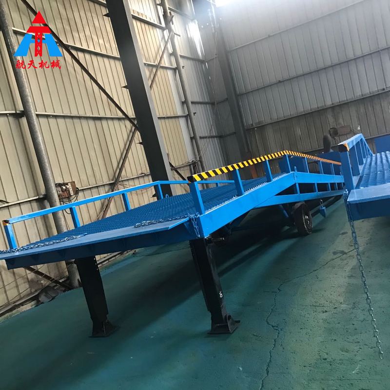 移动式登车桥在现代物流中已是一种非常易见的结构形式,它是企业物流链的起点与终点,是企业快速、安全周转产品及货物的一个装卸货操作平台。 装卸货操作平台的高度固定,但来往运输车厢的厢地高度不一,运输车辆与装卸货站台之间总是形成一定的高度落差或间隙。造成搬运叉车不能进出运输车辆直接装卸货物。运用登车桥提供可靠的连接,使搬运叉车能够安全、快速地进出运输车辆进行装卸货作业。使用过程平稳可靠,安全性能高,装卸货物时节约了大量时间,省却了大量人力,使装卸货物大大的提高了效率。台面采用特制的菱形网格板有可靠的强度,它的菱形网状结构,充分保证了防滑性能,使叉车有更好的爬坡性和可操纵性,即使在雨、雪天气,仍能保证正常使用。